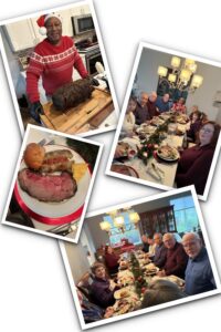 The menu consisted of Appetizers of Spinach Dip nestled in a sourdough bread loaf, and a Scrumptious Crab Dip (contributed by Greg & Connie Konsavage). The entrée of Garlic Prime rib, baked potatoes, and mimosas (provided by Thom & Paula); Side dish of cornbread casserole (courtesy of Jakie & Jennifer Kaneshiro); Beautiful green garden salad (brought to us by Bob & Peggy Wheaton). There were two, yes two, Desserts: Boston Cream Pie (Mike O’Dorney’s contribution, and Roger & Evaline Lamm presented us with a delightful French Apple Tart.